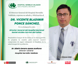 El Director General del Hospital Hermilio Valdizán expresa su cordial saludo y felicitación al Dr. Vicente Bladimir Ponce Sánchez, por su designación como Director General del Hospital Nacional Daniel Alcides Carrión del Callao.